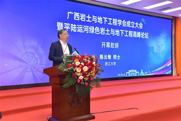 2023年5月14日,广西岩土与地下工程学会成立大会暨平陆运河绿色岩土与地下工程高峰论坛在广西大学召开。中国科学院院士、浙江大学陈云敏教授,广西壮族自治区科学技术协会朱其东副主席,国际土力学及岩土工程学会前主席、香港工程科学院院士、英国皇家工程院院士、香港科技大学吴宏伟教授,中国岩石力学与工程学会副理事长、西南交通大学何川副校长,广西大学马少健副校长出席成立大会并致辞。据悉,来自全国50多家单位的200余名专家代表参加本次成立大会和论坛。